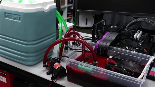 最近海外博主TrashBench展示了他的疯狂DIY浸没式冷却装置。