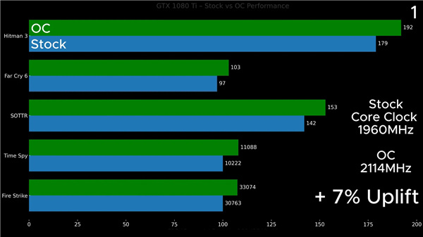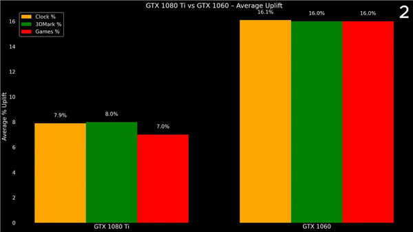 他还加入了一块1080 Ti进行测试,1080 Ti在空冷下已经能够达到1960MHz,但在变速箱油冷却下,其频率提升到了2114MHz,性能提升了大约7%。
