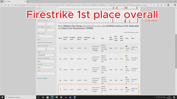 当然这主要归功于GTX 1060在这种环境中能够达到的2190MHz加速频率,比其默认的1886MHz有了大幅提升,最终还获得了Fire strike全球第一名。
