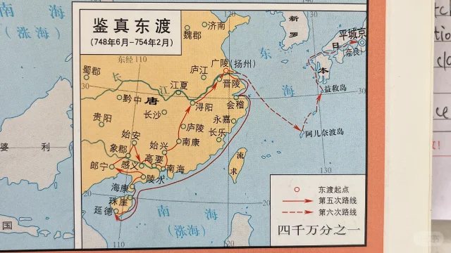 第二次(743 年),船隊剛出海就遇到風暴,船被吹到舟山羣島,物資全毀,隨行僧人還摔死了 3 個;