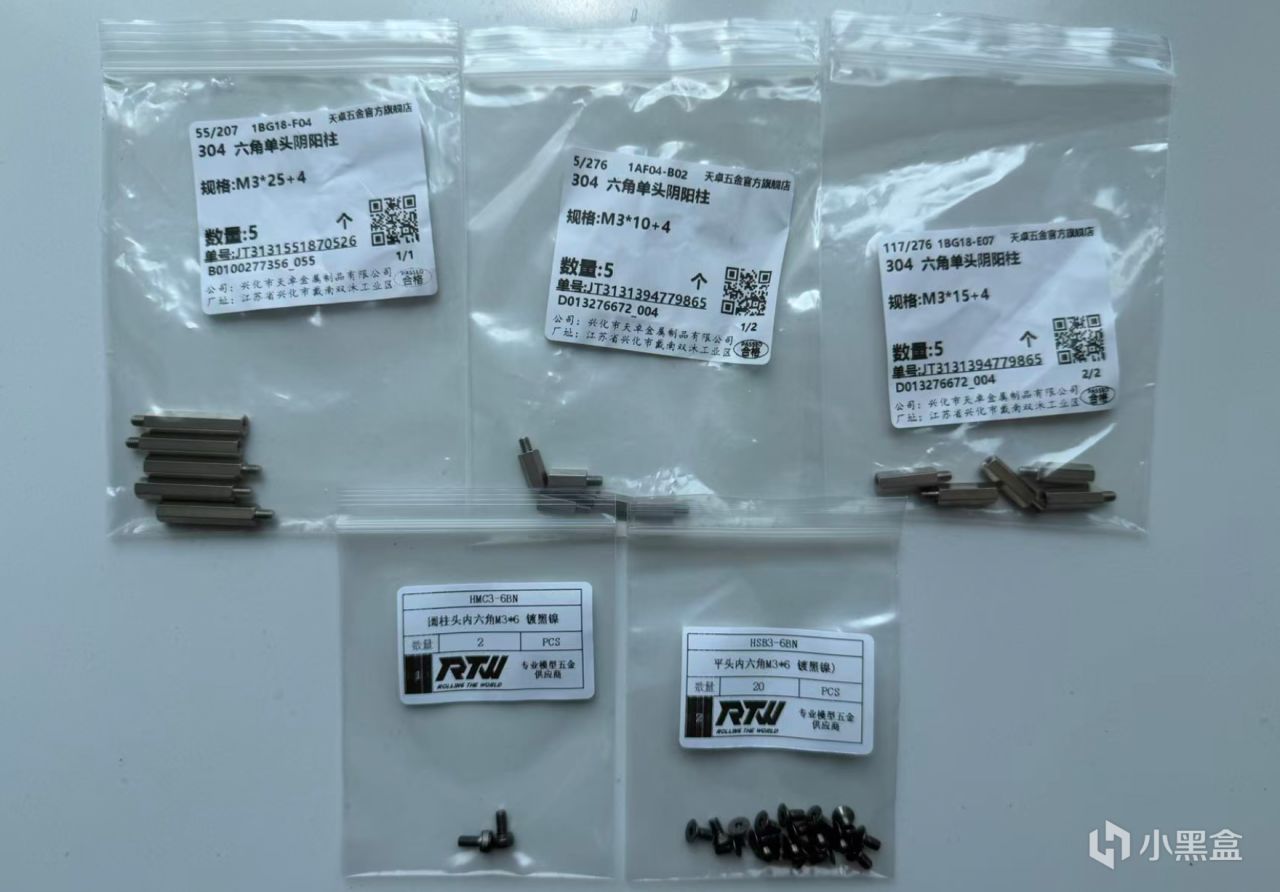官方的沉头螺丝不够用,采购了点芳生镀镍螺丝和不锈钢螺柱(便宜不心疼),不够,后期又买了点DENG家的不锈钢螺丝,记得采购6#32,1/4英寸与3/4英寸的若干(用于电源/显卡/风扇),你不会想要面对东西都到齐了没有螺丝装的窘境。