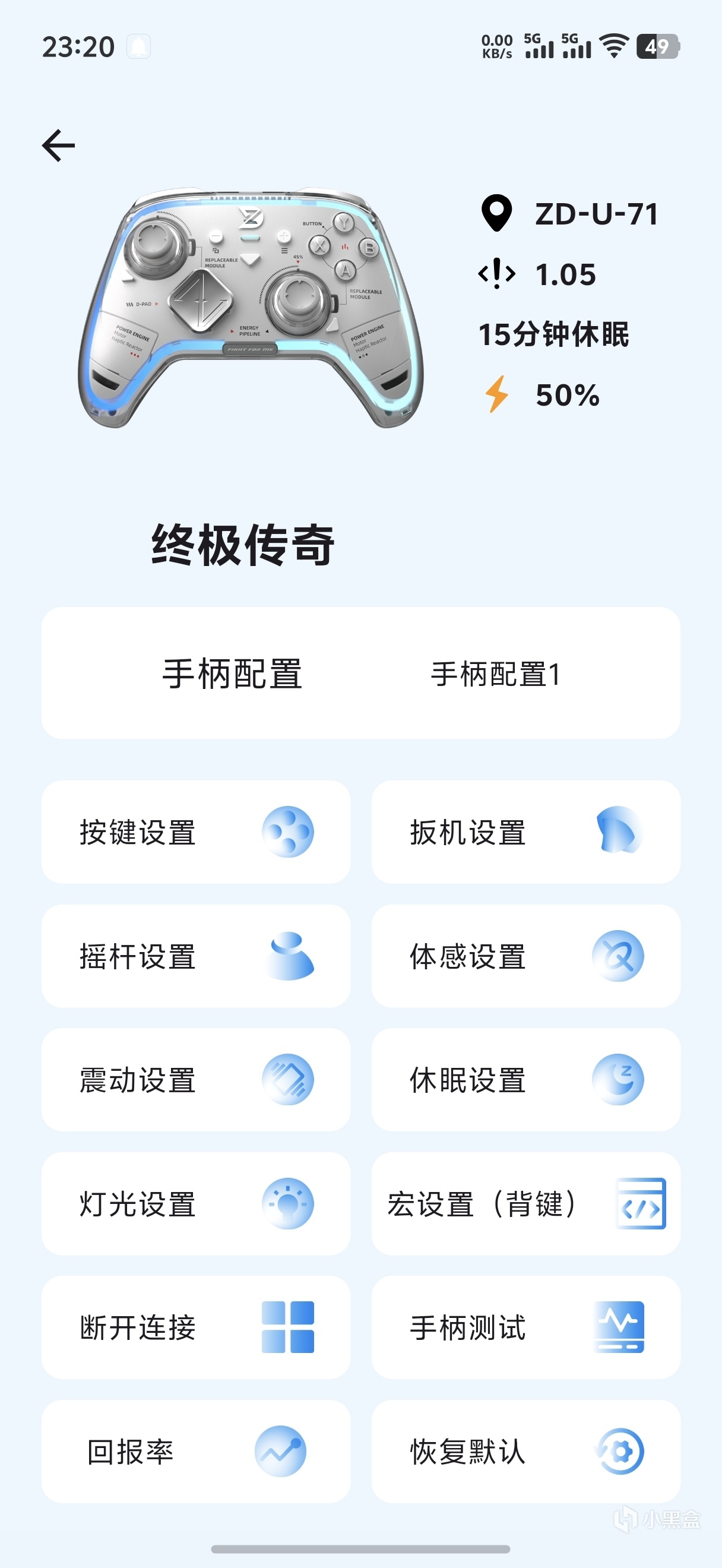 驱动方面还没有PC端的驱动软件,只能使用手机端,这点比较可惜。手机端的使用体验倒也不错,连接速度很快,页面整洁,按键、扳机、摇杆、震动等设置应有尽有,也可以快速切换手柄的配置方案(共四个)。