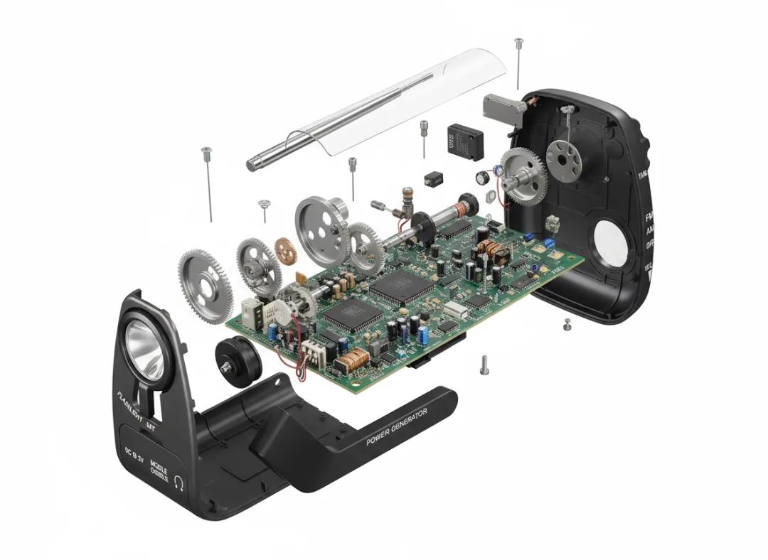 提示词:生成产品的超详细分解图,金属部件与电子元件悬浮于半空中,完美对齐,清晰揭示内部结构,呈现未来科技美学;8K分辨率,搭配柔和的电影感光线,高度写实。