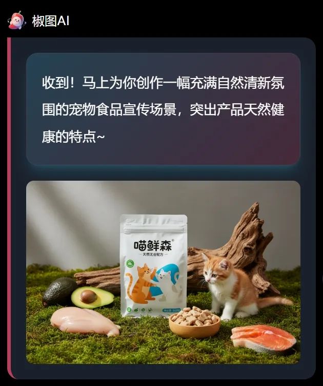 提示词:制作产品宣传图,将产品置于宁静森林溪流边的自然背景中,周围环绕茂密绿叶和潺潺流水,营造出纯净野趣的氛围,画面组成元素丰富,产品后方溪边躺着一块苔藓覆盖的巨石,产品周边还有新鲜的牛排肉块,蓝莓,金枪鱼片,以及一个竹篮满满的有机谷物,旁边一只活泼的狗狗,光影柔和,模拟晨曦阳光照射,让整体画面显得生动且富有层次感,突出了宠物食品有机、健康的特点,中景构图,主要凸显产品。