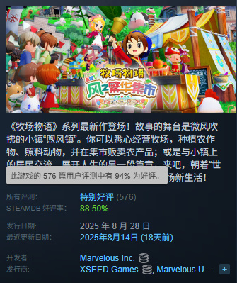 直到最近发售的《牧场物语 来吧!风之繁华集市》,Marvelous看上去终于扭转了过去的颓势——8月28日上线以来,这款新作的Steam版本好评率已经累积到了94%。