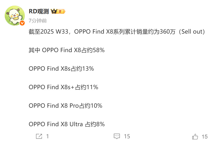 OPPO Find X8系列累计销量约为360万,其中X8占比约为58%,X8s占比约为13%,X8s占比约为11%,X8Pro占比约10%,X8Ultra占比约8%,从目前的趋势看,生命周期内箱突破500万有点难。