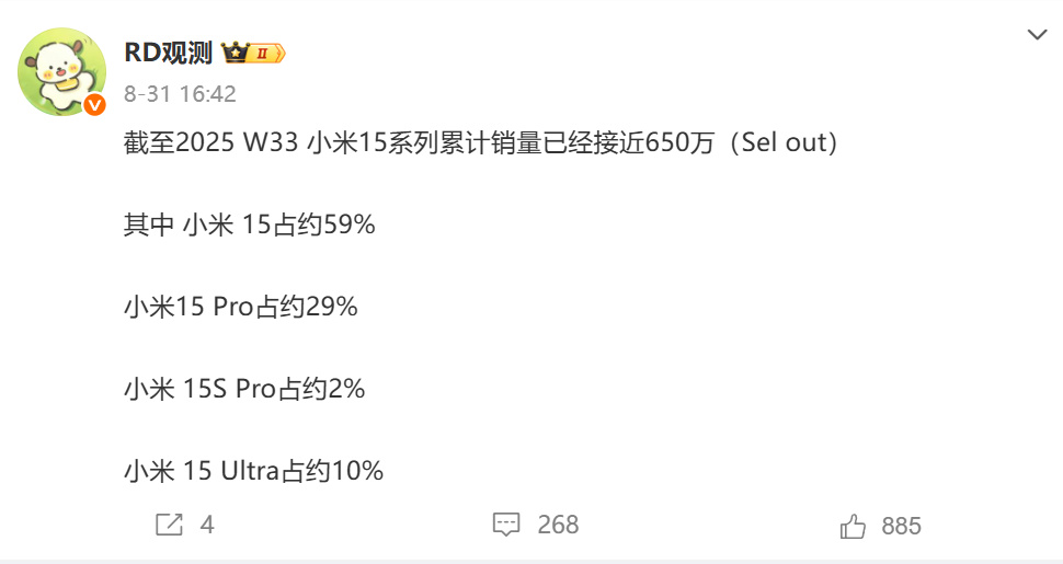 小米15系列的销量仅次于华为mate70系列,在国产旗舰手机中排名第二。小米15系列累计销量接近650万,其中标准版占比约为59%,Pro版占比约为29%,15S Pro(澎湃O1)占比约为2%,Ultra占比约为10%。小米16系列将于9月底或者10月初发布,小米15系列的生命周期接近尾声,目前距离千万还差350万,突破千万基本无望。