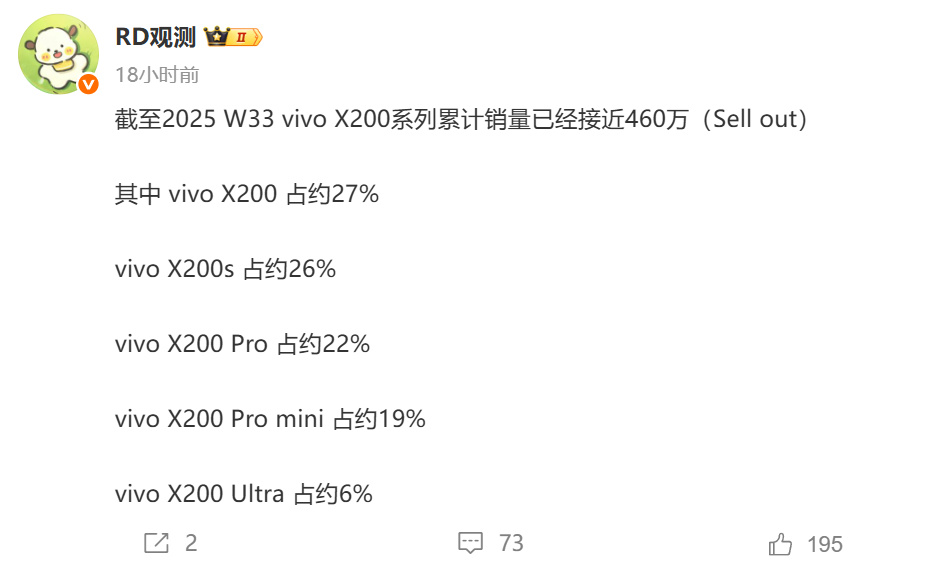 vivo X 200系列累计销量接近460万,其中X200占比约27%,X200S占比约26%,X200Pro占比约22%,X200Pro mini占比约19%,X200Ultra占比约6%。X200系列的生命周期也接近尾声,从目前的趋势看,生命周期内肯定能突破500万。