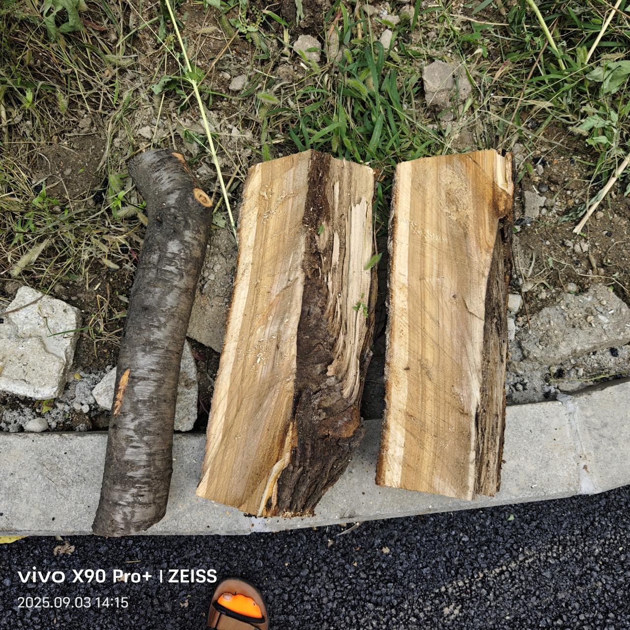 伐木工人又把榆树旁边的桃树处理了。一段桃木落到猫姑手里。猫姑美滋滋拍照发给小友,说好一并快递给他。
