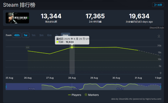 该数据在发行当天达到了19634名Steam玩家同时在线之多。众所周知,工作日发售的游戏在周末会迎来在线玩家人数的峰值,但《合金装备3:重制版》却没有出现这种情况。而作为对比数据,《合金装备 5:幻痛》在发行后不久就达到了91195名Steam 玩家同时在线的峰值。