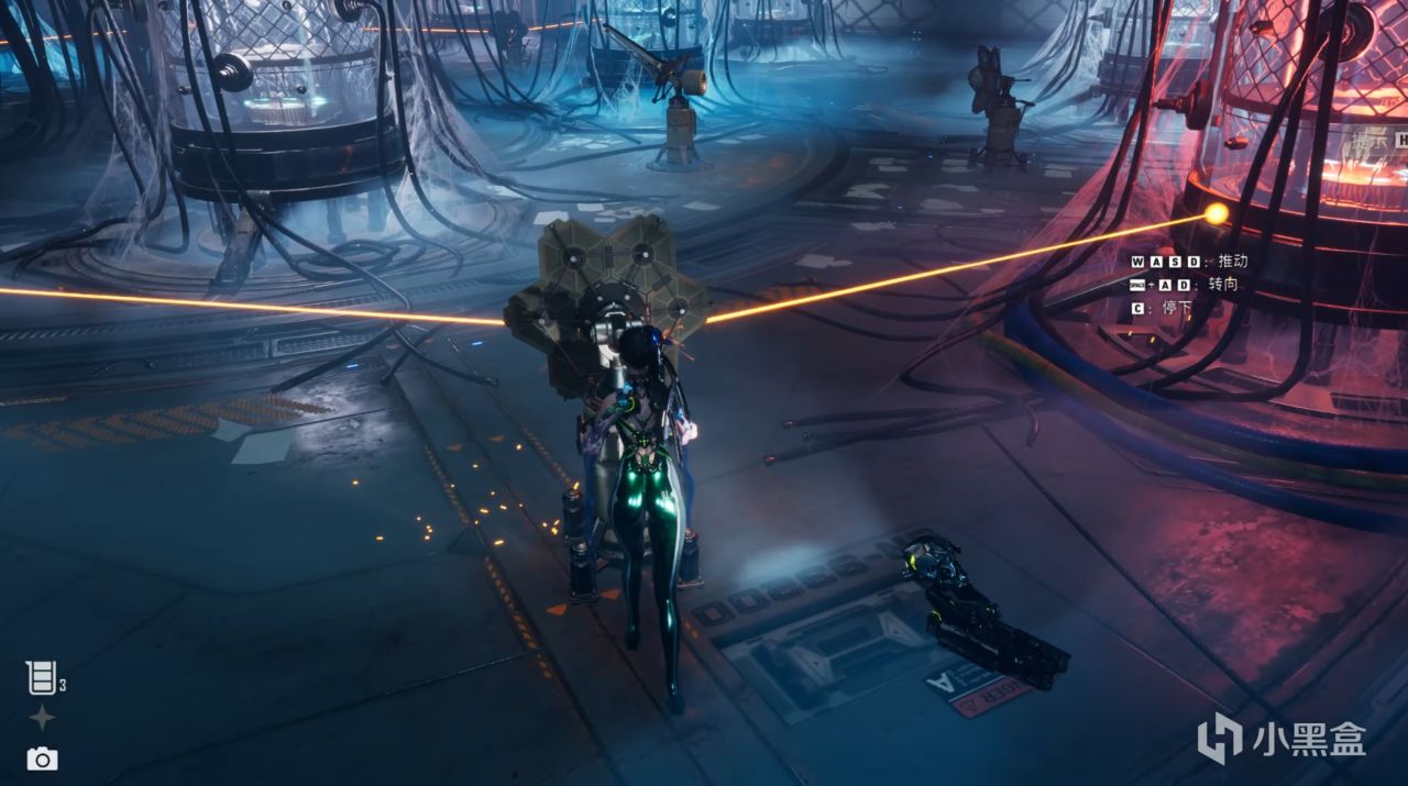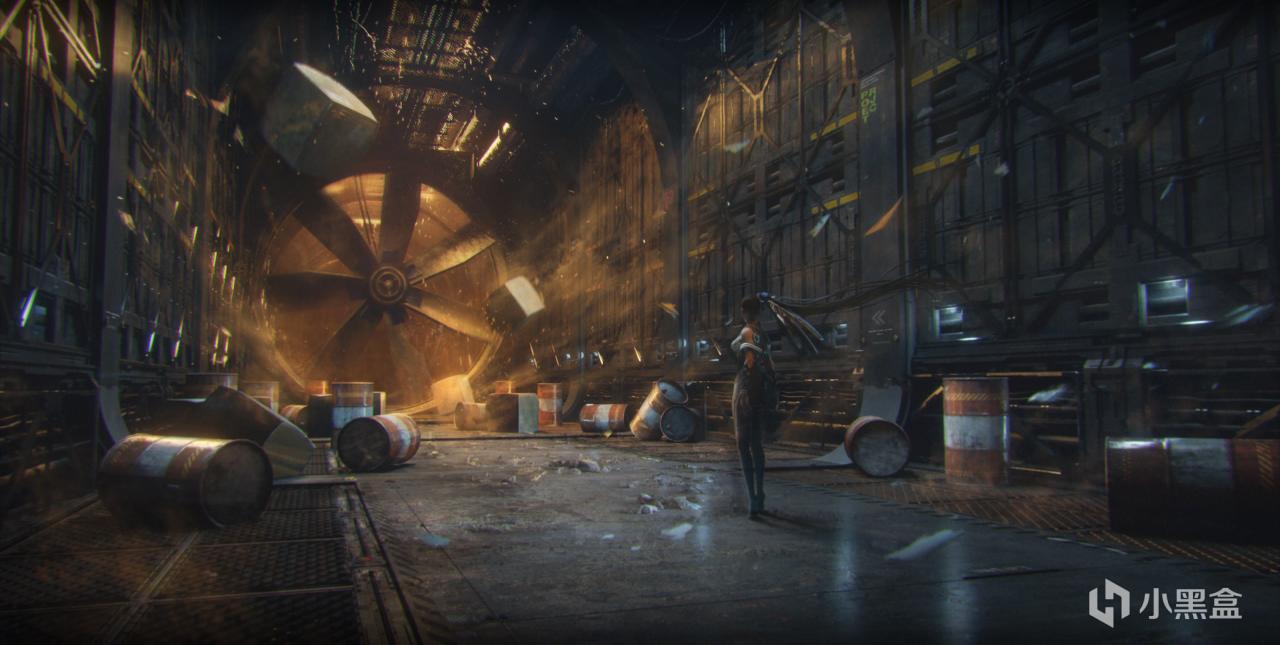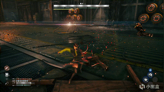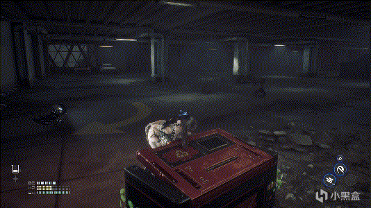 繞過天井就是一個相對開闊的平臺。向下是更低的地面,有怪;平臺對面是另一個小的天井③,其上有寶箱,需要藉助被機械臂夾在空中的金屬箱子才能到達。關卡中,這些運動着的、高低錯落的金屬箱子成爲了我們向高處、遠處運動的必要中介。