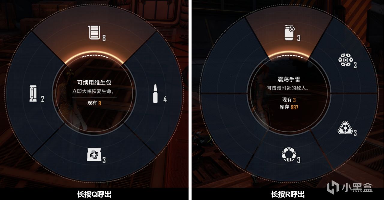 遊戲中有兩類道具可供使用——治療道具和手雷。使用快捷鍵呼出輪盤後可快捷切換。