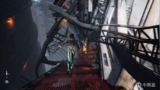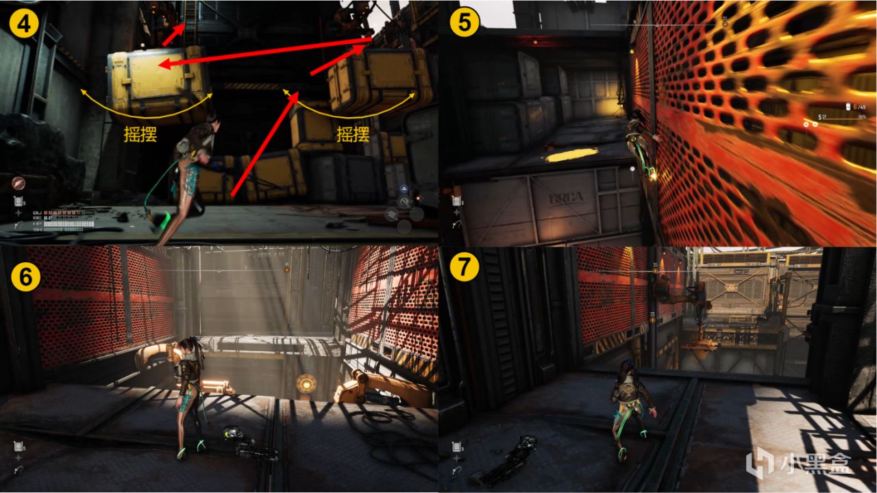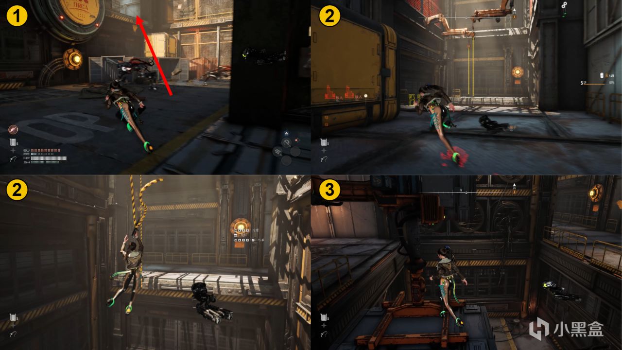 通過堆疊和空中的鐵箱,我們能夠到達原來天井③的上方,利用可以跑酷的側壁越過天井到達對面;類似的,我們能最終到達原本無法跳上去的平臺,完成這一段的關卡。