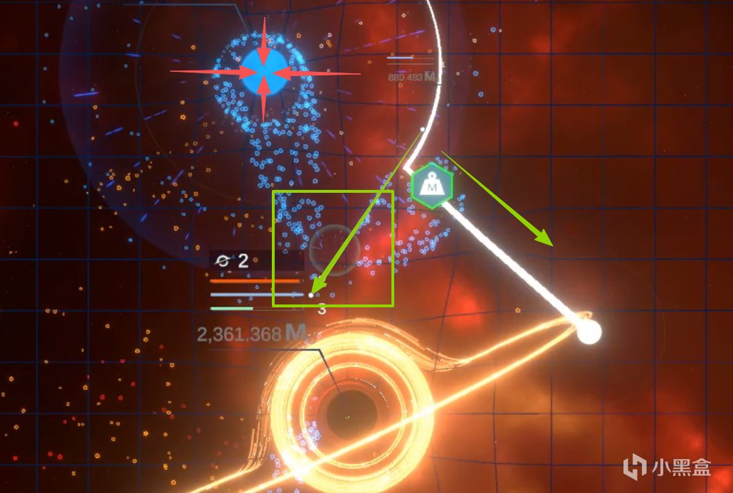 我首先想到的第一种可能,是那个六边形的浮游质量,它是之前某个恒星爆发的时候丢失的大部分质量打包而成的一个浮游物,天体拾取它能够直接获得对应的质量。这个浮游物,玩过的朋友都知道,有时候携带的质量是非常巨大的。那么,有没有可能是公转天体在极度接近它时,被它的引力影响形成了一个高速转向的引力弹弓?