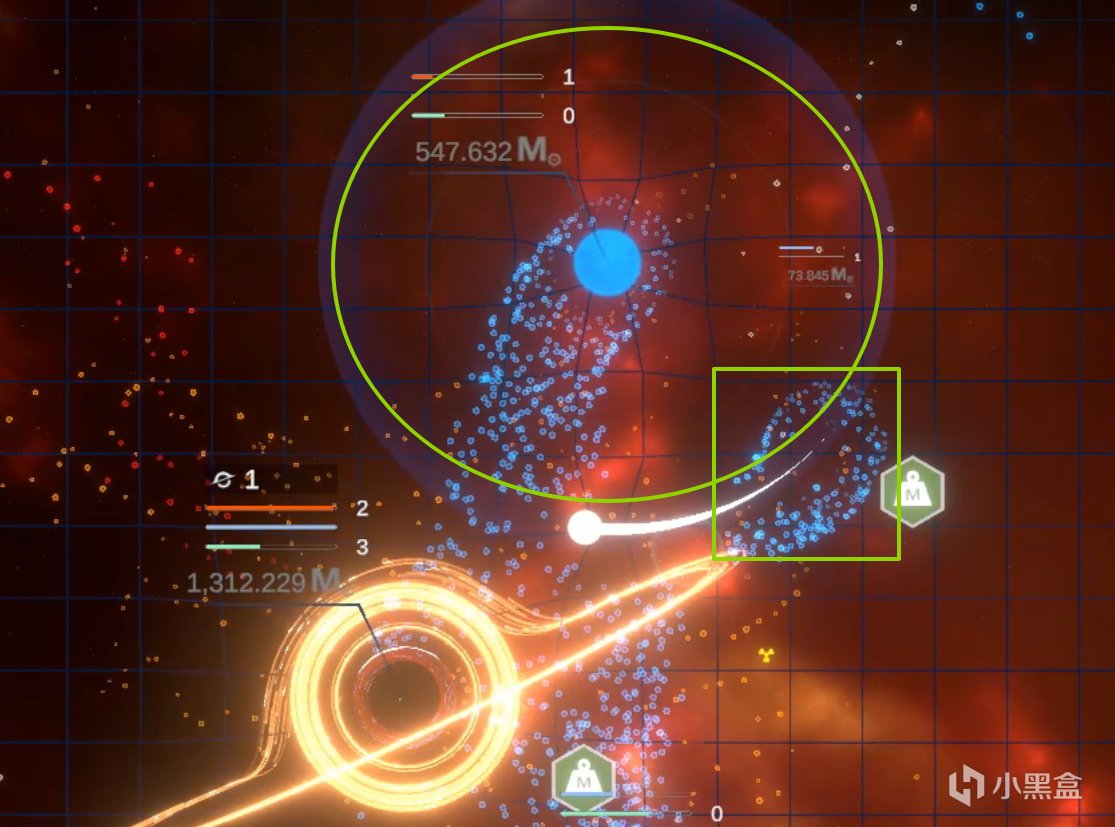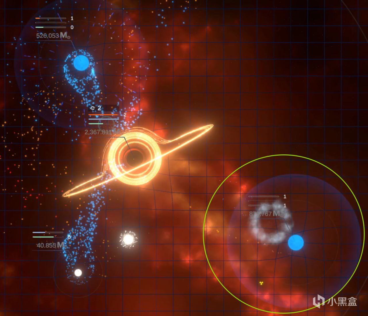 是的,简单来说,为了模拟相对论,在靠近黑洞的区域运算是可以在时空上叠加的,这里面有一种机制允许在时空被扭曲的区域进行看起来是不同步的运算,这种运算中就会出现一个物体未来的自己参与到影响过去自己的过程(简单视作两个对象),其实在这段画面中,还有一个辅助例子可以更简洁地说明这件事,就是下图中这个公转天体一开始损失的质量,在它绕行一圈回到初始位置的时候被它自己重新获取了(动图里面可以看到质量延迟滞留)。
