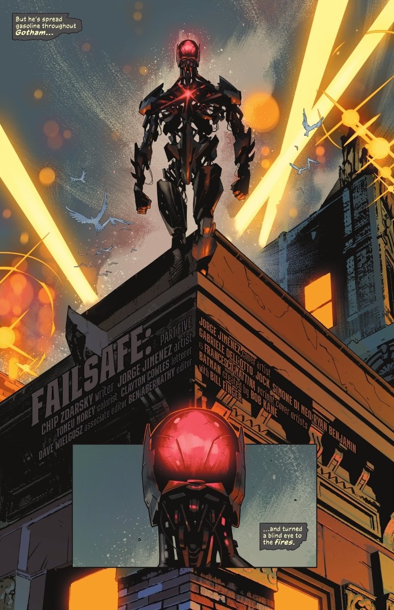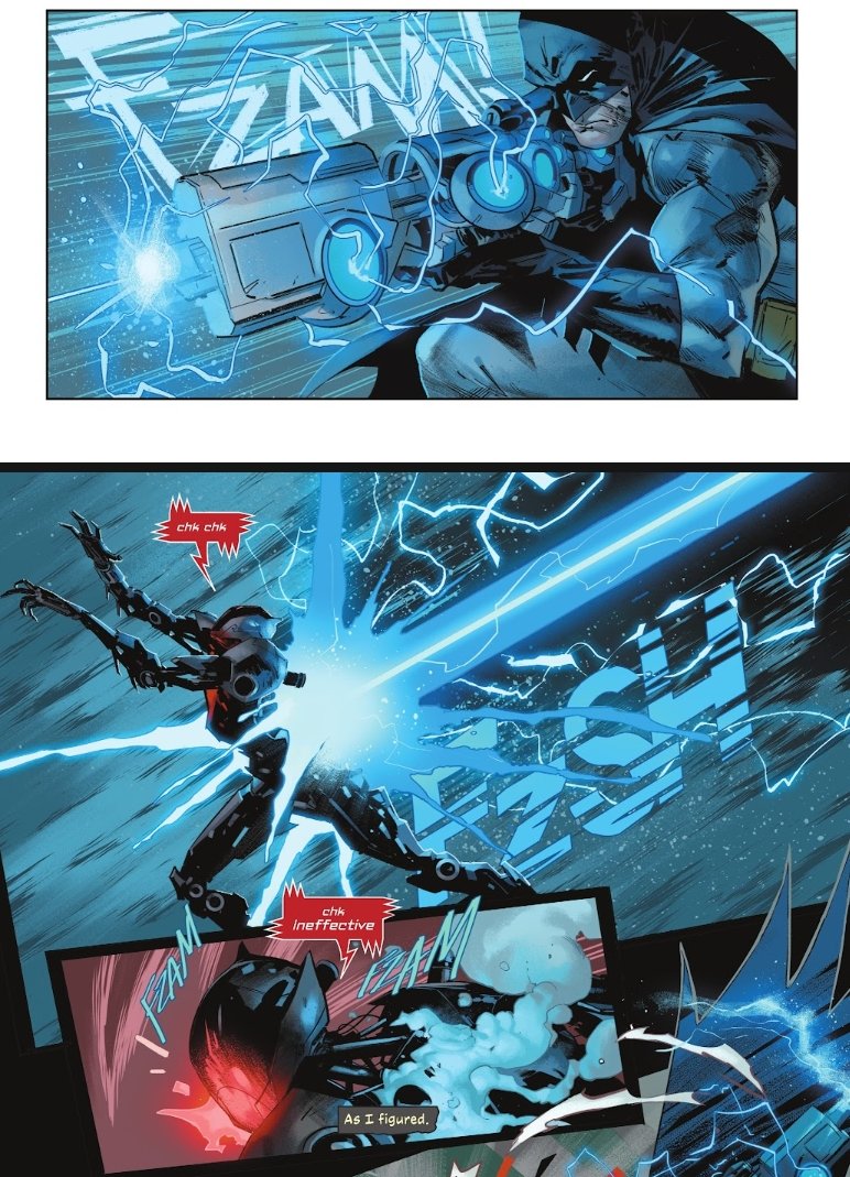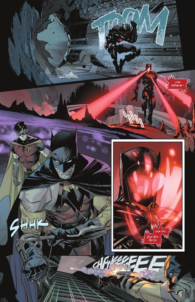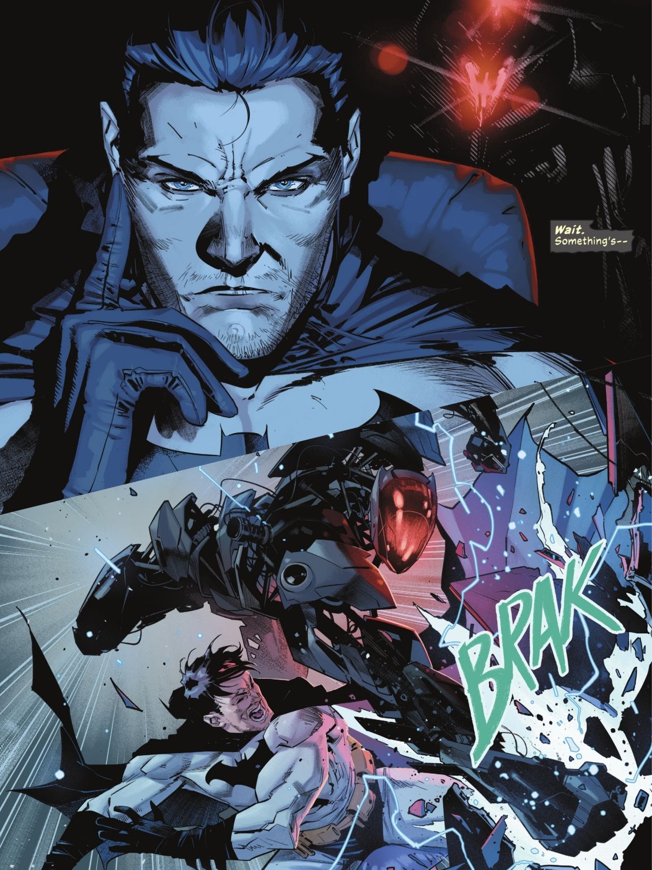 隔天老爷巡逻回家,直接被一个通体漆黑冒着红光的机器人伏击,那机器人有着蝙蝠耳朵,高大却身手敏捷矫健,并且仿佛能够预测蝙蝠侠所有的行为,在体术上直接揍得老爷屁滚尿流。