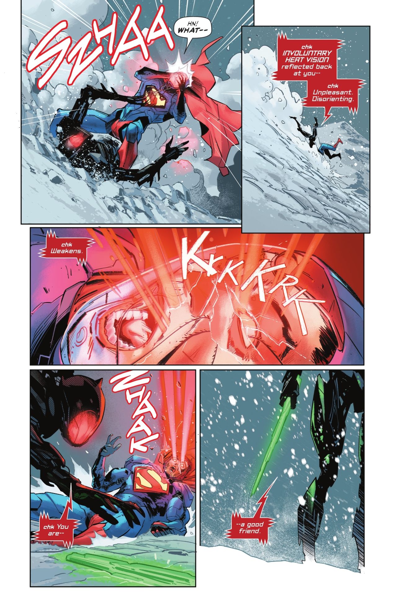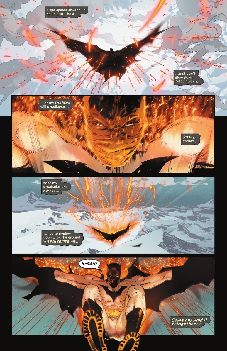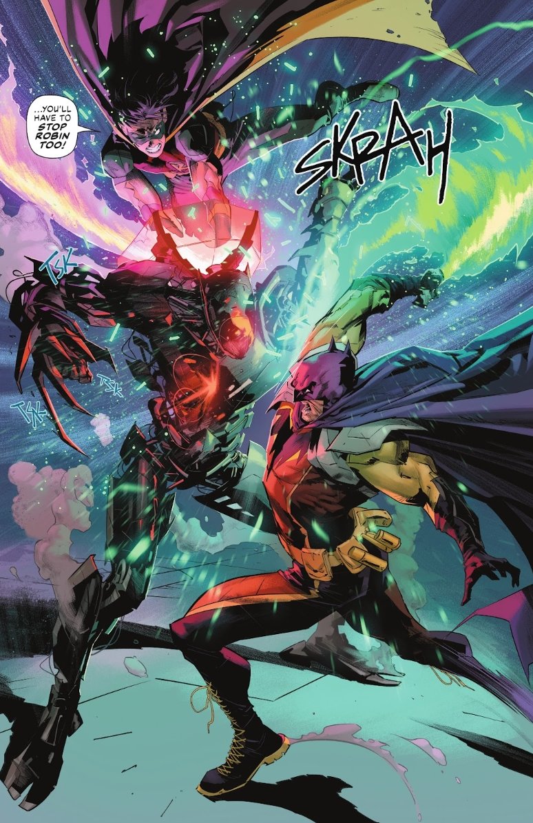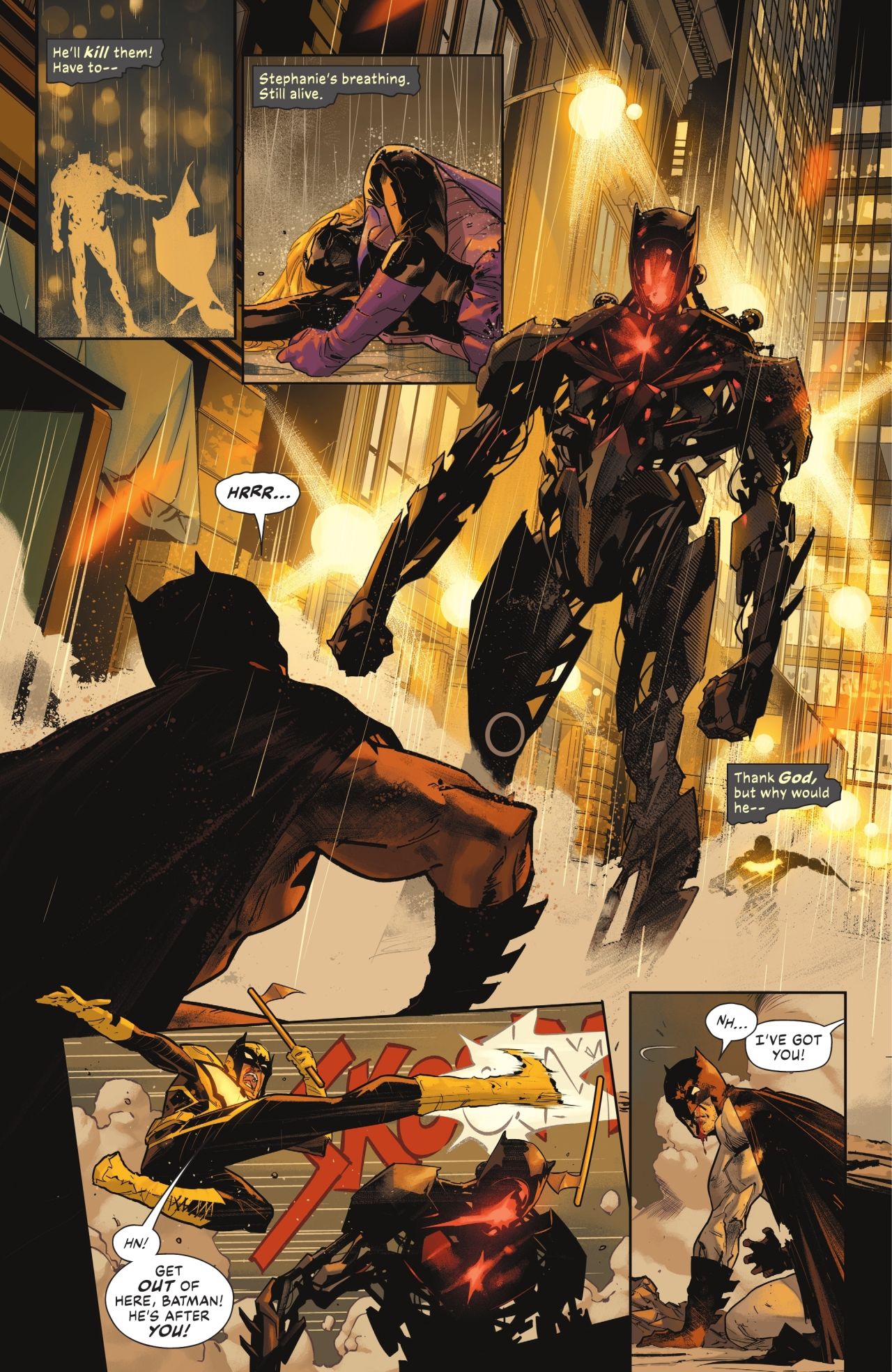 隔天老爷巡逻回家,直接被一个通体漆黑冒着红光的机器人伏击,那机器人有着蝙蝠耳朵,高大却身手敏捷矫健,并且仿佛能够预测蝙蝠侠所有的行为,在体术上直接揍得老爷屁滚尿流。