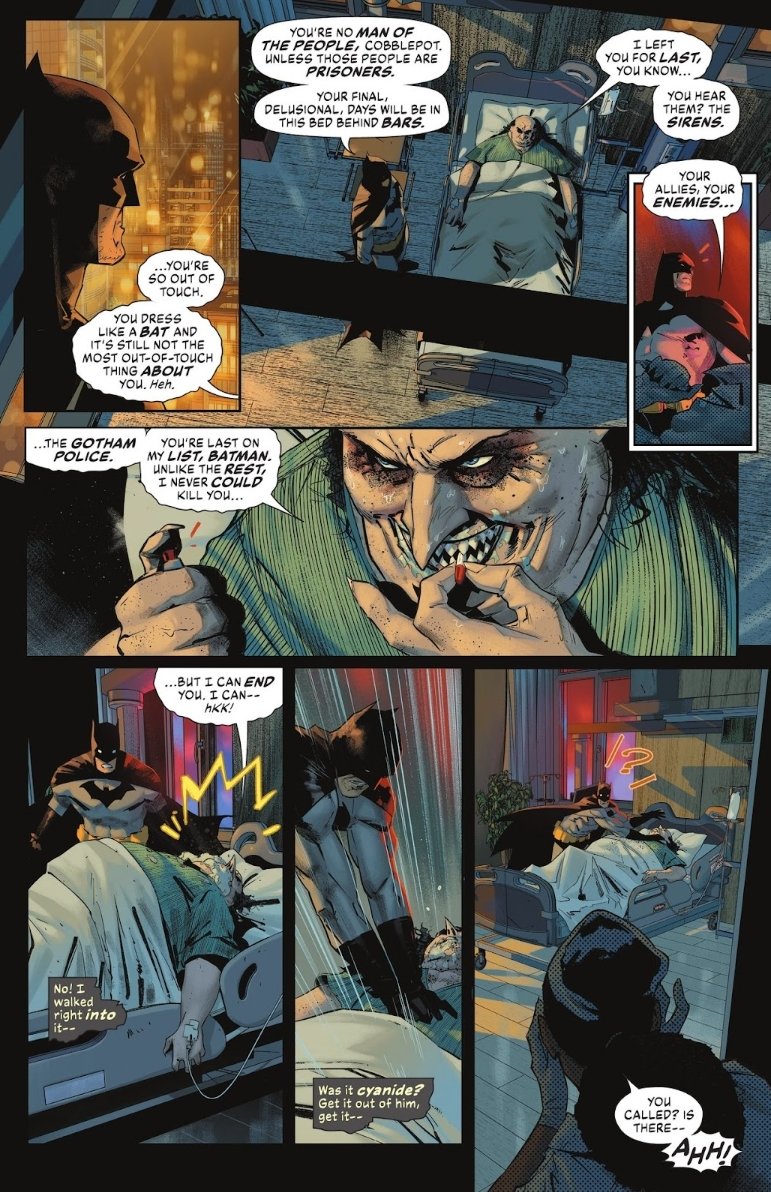 究其原因,其实是因为企鹅人突然中了毒,命不久矣,不过既然蝙蝠侠有这么多厉害的装备,企鹅人认定那他也是富人(真有你的,这次还真猜错了),因此在蝙蝠侠探视企鹅人时,他通过服毒使目击证人以为是蝙蝠侠杀害了自己。