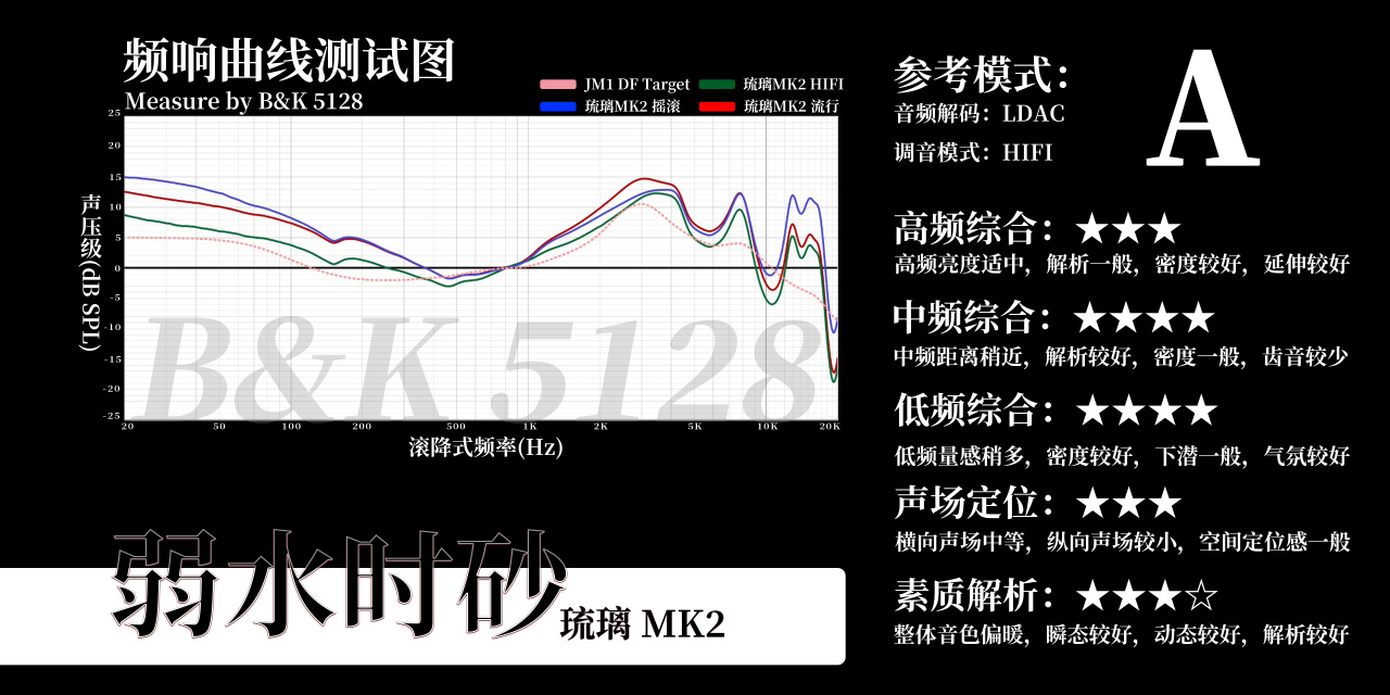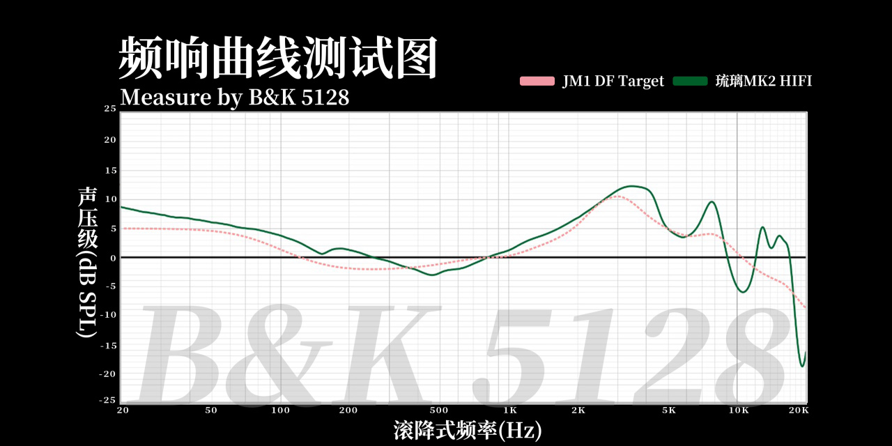 从频响曲线来分析,JM1作为参考。琉璃MK2的HIFI模式会稍微平直均衡一些,我的听感和测评也会基于这个模式。