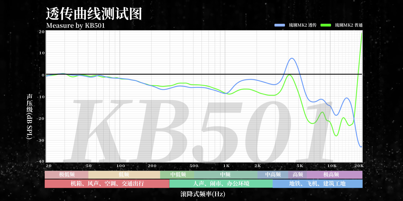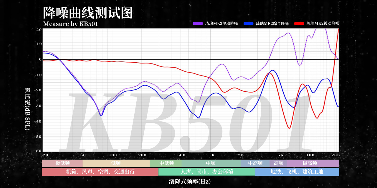 琉璃MK2的降噪表现优异,虽然低频附近的降噪不算优秀,不过峰值点处于人耳最为敏感的中频附近,再加上超宽的主动降噪频宽,提供了相当不错的日常通勤环境的消噪。