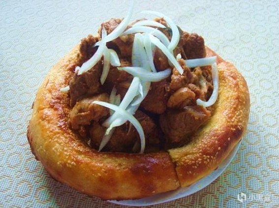 馕包肉,维吾尔语音译为“塔瓦喀瓦甫”,是维吾尔族的传统食品,意即锅烧肉,外形呈圆形,以馕包裹炖煮羊肉制成,属新疆风味名食之一。其特点是面肉合一,既可作日常主食,也可作为小吃或宴席菜肴。与普通不含馅的馕不同,库乃其通过将羊肉与胡萝卜、皮牙子等食材炖煮后与馕结合,使馕充分吸收肉汁。和田地区采用沙土烧烤法制作:在沙坑中燃烧胡杨木形成火堆,火灭后将包肉面饼埋入火灰烤制。其他做法需将羊肉切块后加入辣椒酱、草果等调料翻炒,经炖煮至酥烂,再将切块的馕放入肉汤中烩煮入味,最终装盘浇汁而成。 馕包肉这种面肉合一的风味食品非常能代表新疆的传统民族特色。它的食用方式也非常多样化,既可以作为小吃推车或店门前兜售,也可以作为一种风味菜食,登上清真宴席的大雅之堂,作为一种名菜供中外宾客品尝。