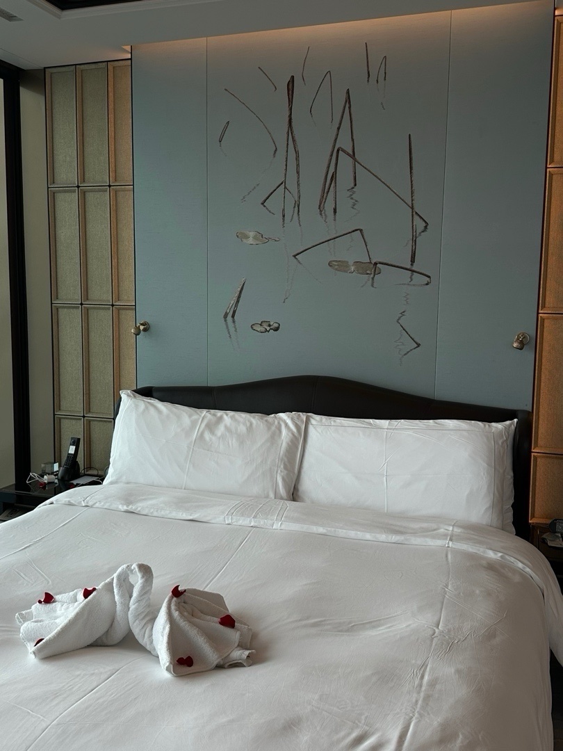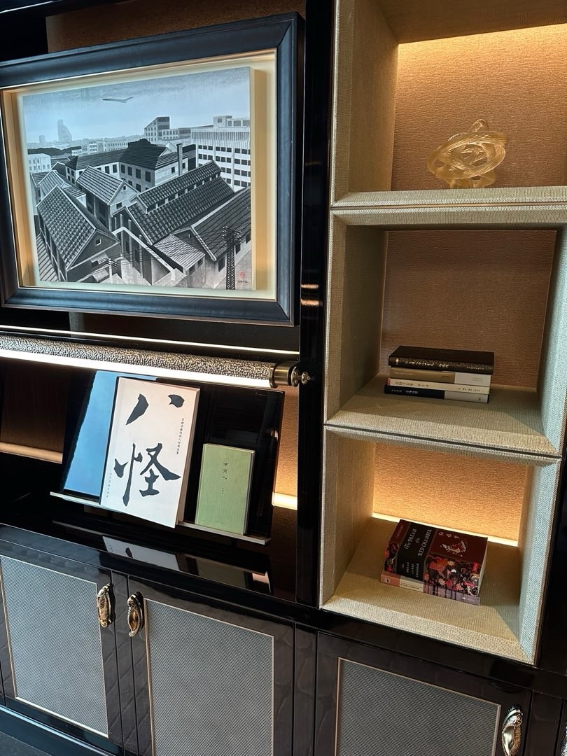 兩點就已經收拾好房間入住了,雖然提前瞭解過套房但是還是被奢華到了,金碧輝煌的走廊,巨大的浴室更衣室會客廳,以及提前準備好的佈置,都體現了南🌰的品質。酒店套房設計巧妙融合了東方美學與西方經典風格,室內陳列着精緻藝術品,不管是書架上的《萬曆十五年》、英文版《紅樓夢》,還是牀背景的殘荷,都流露出獨特的藝術氣息和美感。