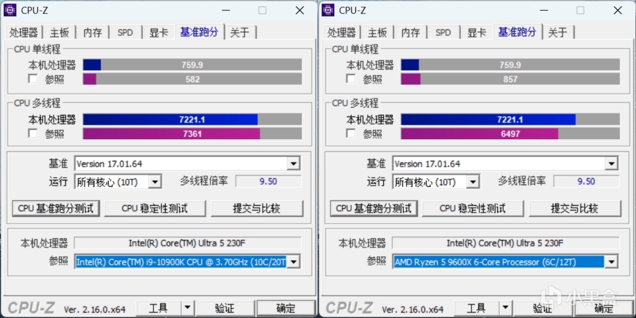 酷睿Ultra 5 230F默認設置在CPU-Z(V17.01.64)下單線程性能得分爲759.9,多線程性能得分爲7221.1。