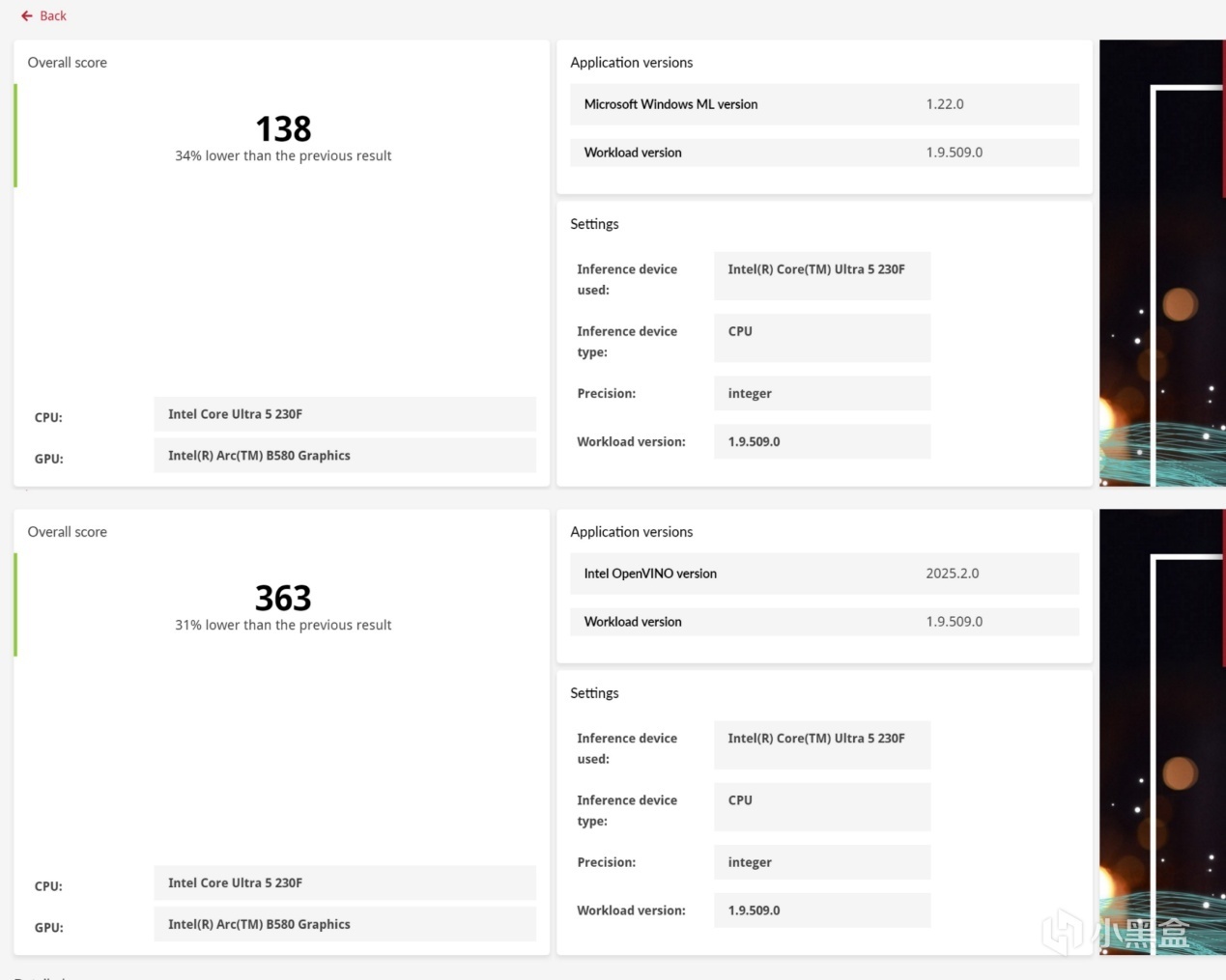 酷睿Ultra 5 230F默認參數下搭配UL Procyon Al Computer Vision Benchmark下的Microsoft Windows ML和Intel OpenVINO進行測試,在CPU integer下的測試結果分別爲138和363。