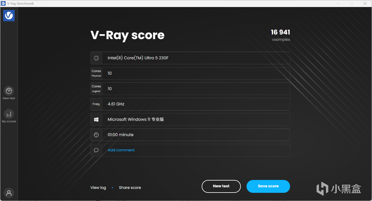 酷睿Ultra 5 230F在V-Ray CPU下的測試結果爲16941。