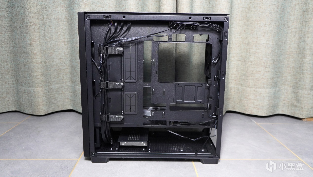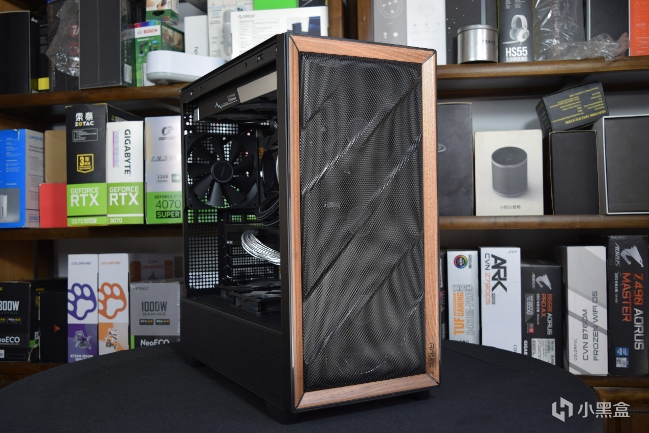 前面板四周加入了木材設計來提升質感和視覺觀感,同時還自帶5把無光風扇,即前置3把12釐米風扇、後置1把14釐米風扇以及底部1把12釐米反向風扇,基本可以滿足大部分人對機箱內部的散熱需求,免去了另購風扇的麻煩,無光設計的風扇也更適合不喜歡光污染的用戶。