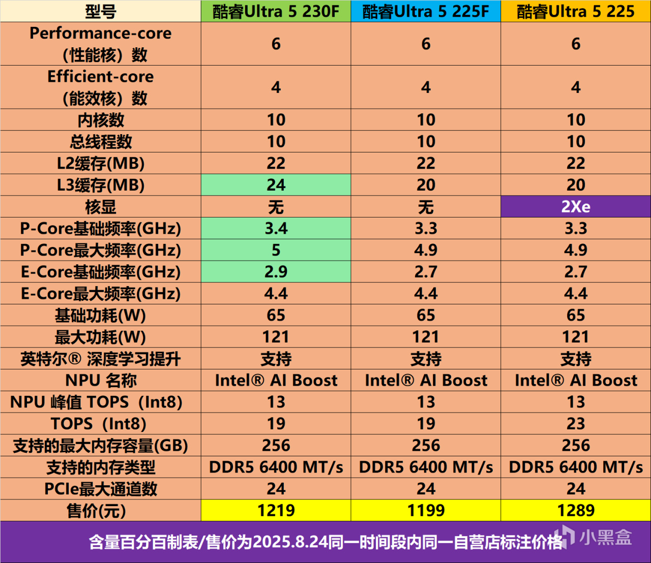 提到酷睿Ultra 5 230F,就不得不說說它的兩位胞弟,即同系列的酷睿Ultra 5 225F和酷睿Ultra 5 225,這三款處理器價格相近,在覈心數、線程數、L2緩存、E-Core最大頻率、基礎功耗、最大功耗等參數方面相同,酷睿Ultra 5 230F除了沒有核顯外,在L3緩存、P-Core基礎頻率、P-Core最大頻率和E-Core基礎頻率都要略微佔優。