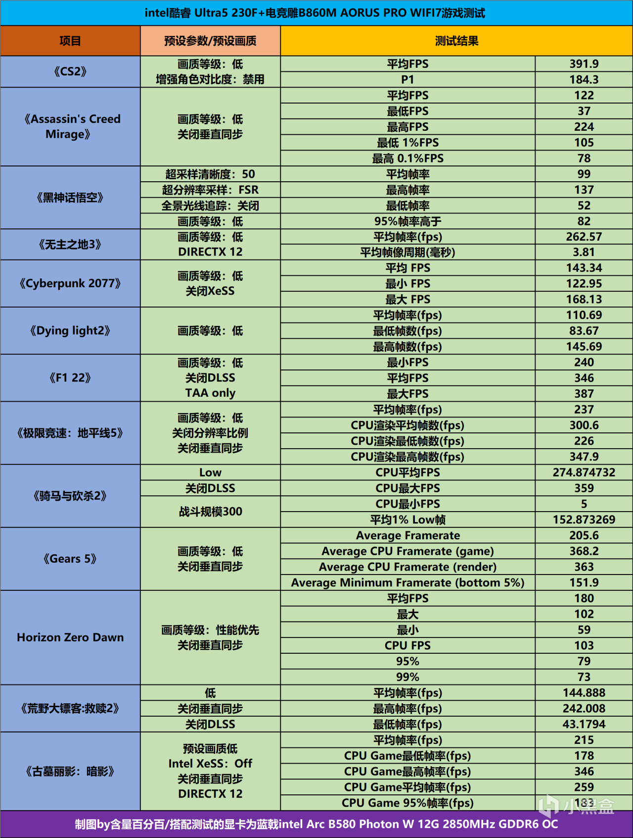 遊戲的部分,我這裏選擇了聯網遊戲和單機遊戲,遊戲默認分辨率爲1080P,畫質選擇Low/低,關閉XeSS、關閉幀生成等。附上游戲測試結果的統計表格。
