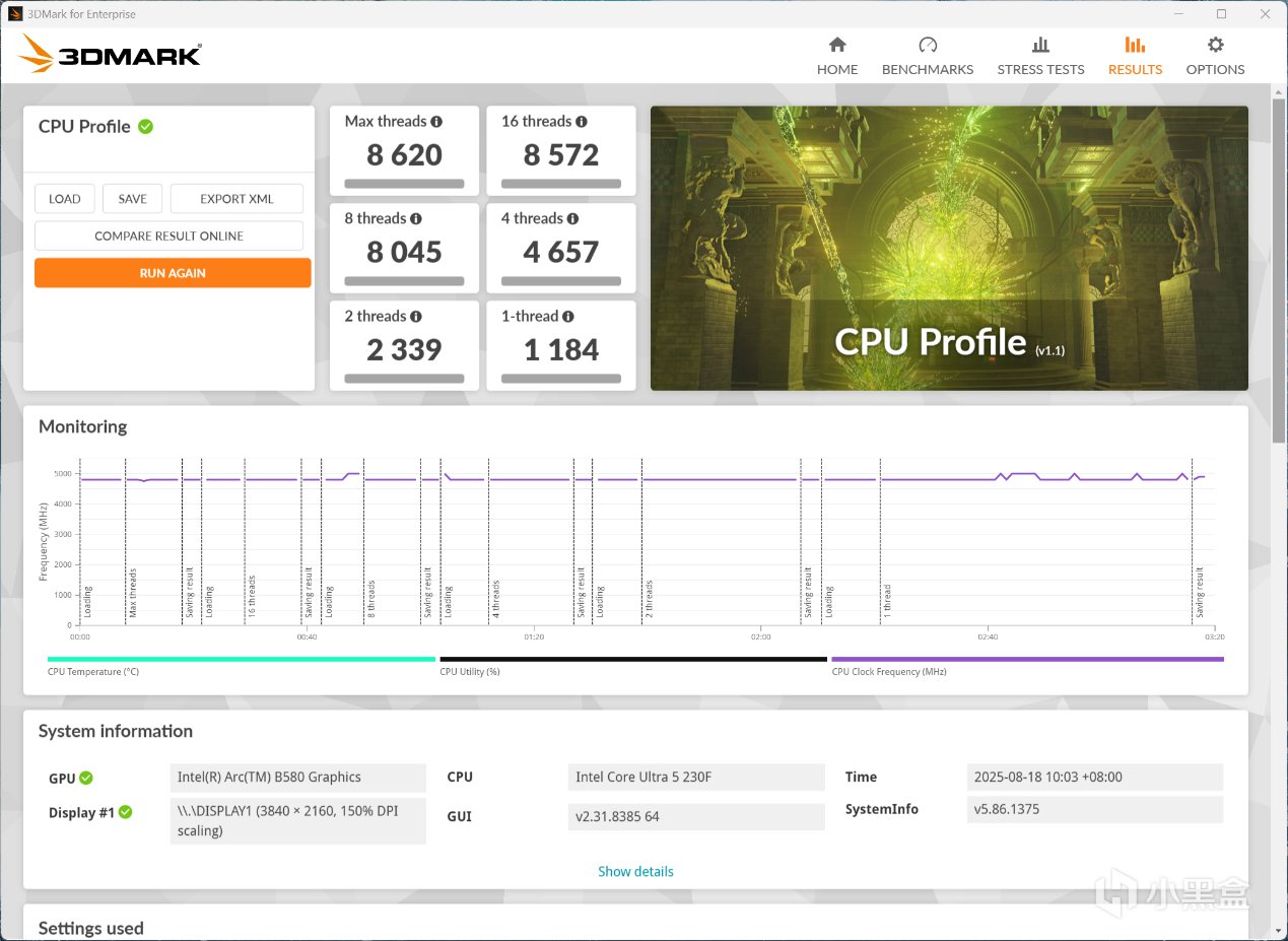 酷睿Ultra 5 230F默認參數下在3DMARK CPU Profile的測試結果如下,單線程成績爲1184,多線程成績爲8620。