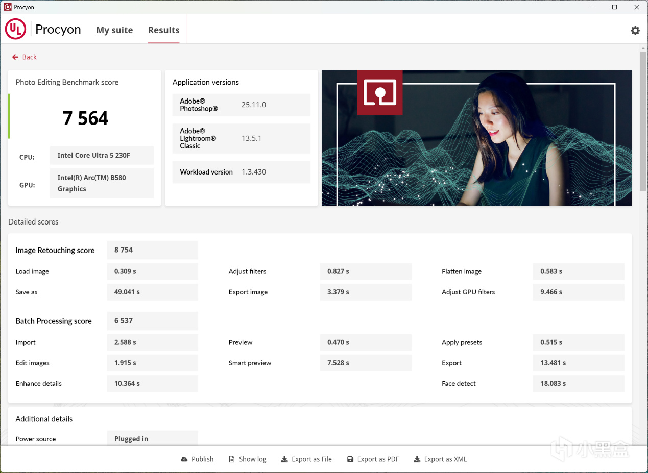 酷睿Ultra 5 230F在 Procyon 圖片編輯功能下的得分爲7564。