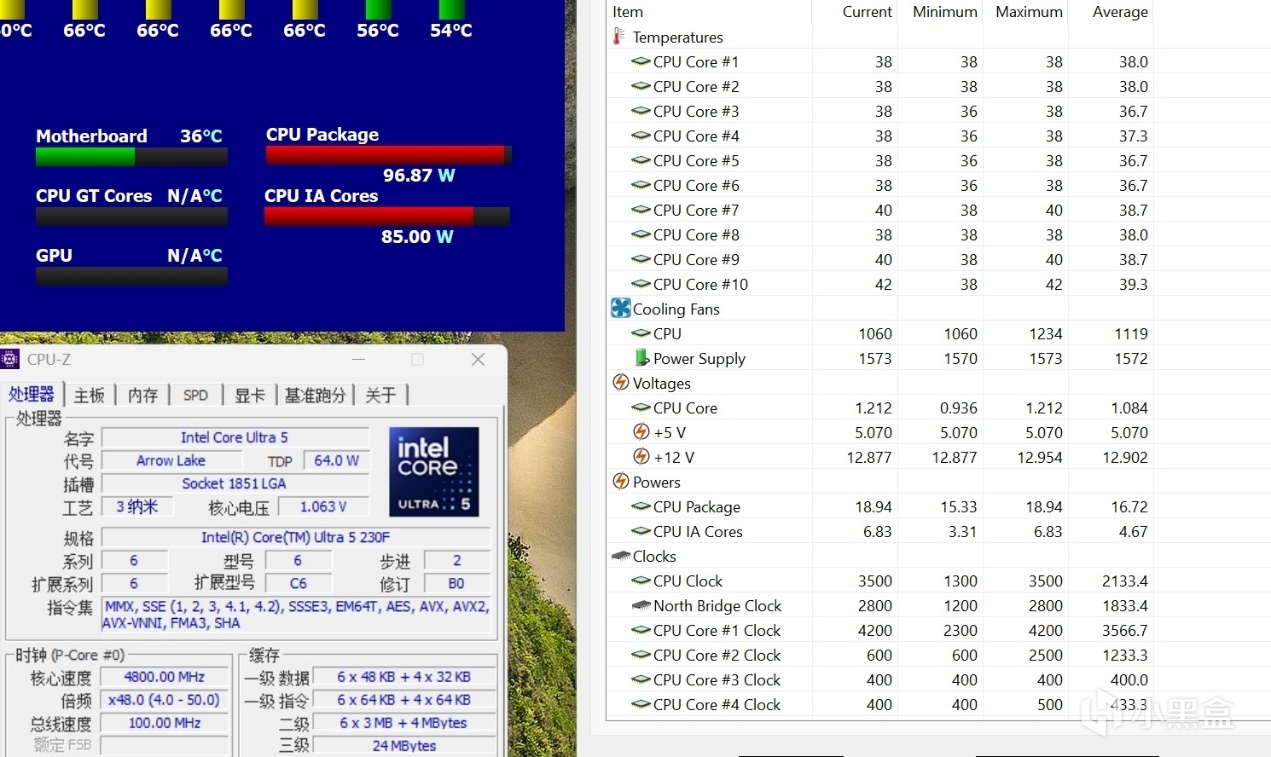酷睿Ultra 5 230F處理器在搭配AIDA64 進行壓力測試時,360水冷散熱器對應的解熱功耗能夠並沒有超過100W,最高就是98W左右,這就意味着散熱器的選購範圍會更大,這應該也是一些人拿酷睿Ultra 5 230F用來組裝ITX主機的一個原因。