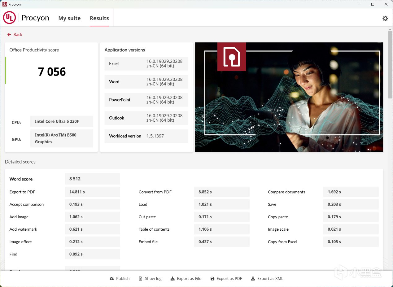 酷睿Ultra 5 230F在 Procyon Office 套件下的得分爲7056。