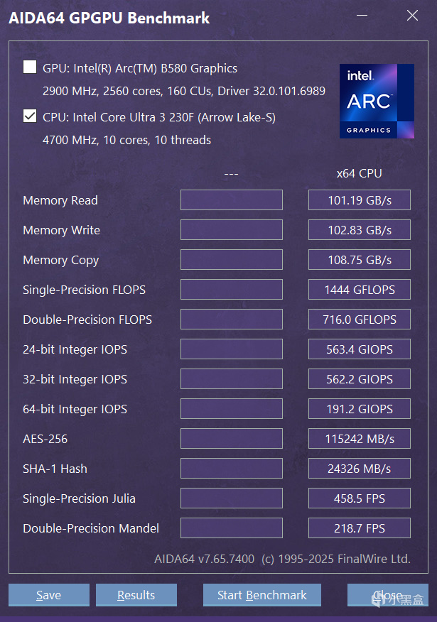 酷睿Ultra 5 230F在默認參數設置下搭配AIDA64 GPGPU測試的Single-Precision Julia和Double-Precision Mandel分別爲458.5 FPS和218.7 FPS。
