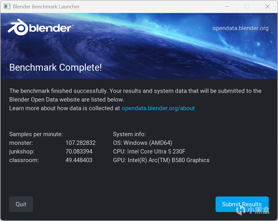 生產力和內容創作方面,我這裏搭配了Blender、V-Ray和Procyon進行測試。其中酷睿Ultra 5 230F在Blender Benchmark下的測試結果如下,monster對應的數據爲107.282832,junkshop對應的數據爲70.083394,classroom對應的數據爲49.448403。