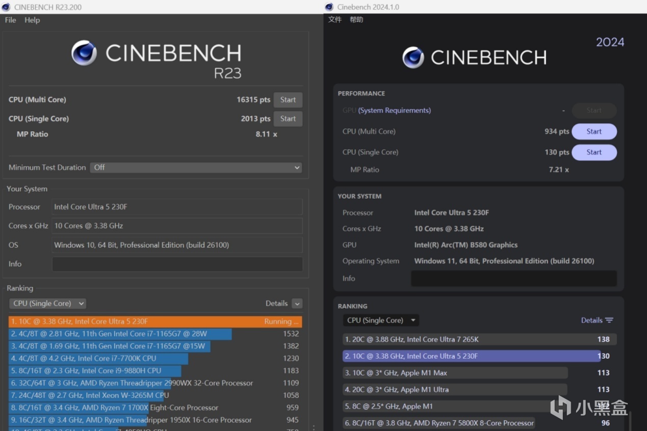 酷睿Ultra 5 230F在CINEBENCH R23下的基準測試結果如下,默認參數下的多核測試結果爲16315 pts,單核測試結果爲2235 pts;在CINEBENCH 2024下的基準測試結果如下,默認參數下的多核測試結果爲934 pts,單核測試結果爲130 pts。