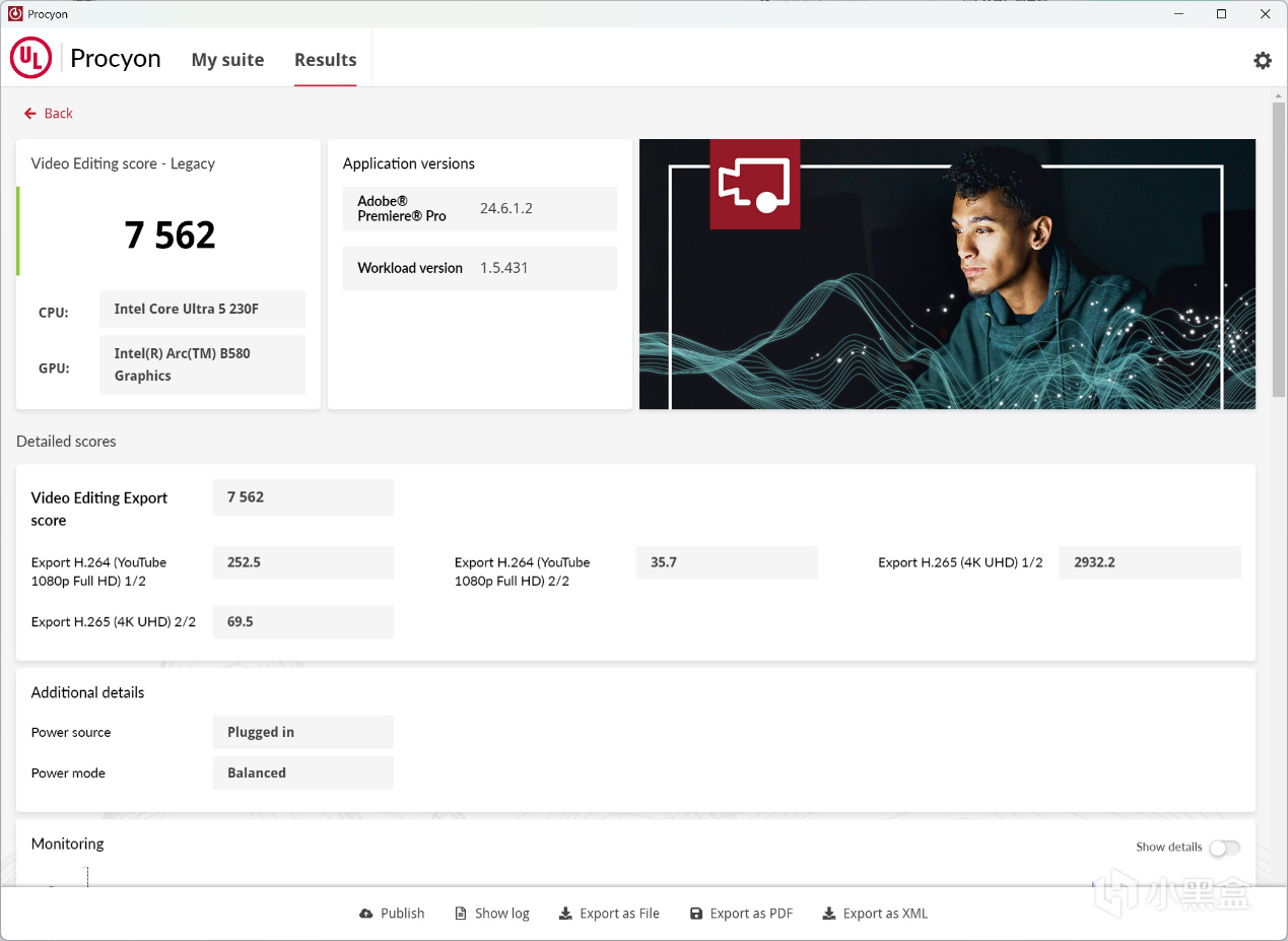 酷睿Ultra 5 230F在 Procyon 視頻編輯功能下的得分爲7562(未開啓GPU加速),與上面在圖片編輯功能下的分數基本相同。