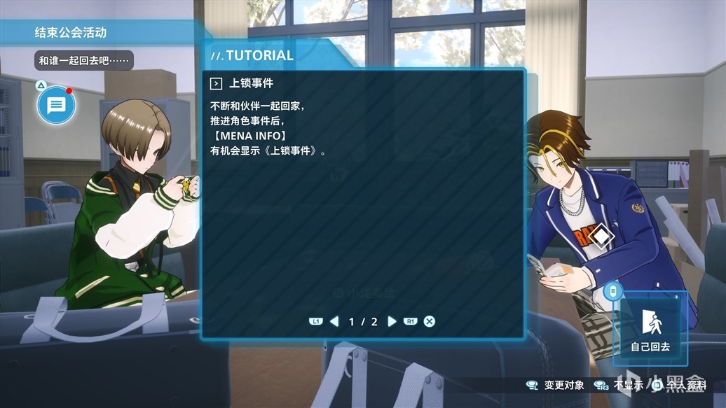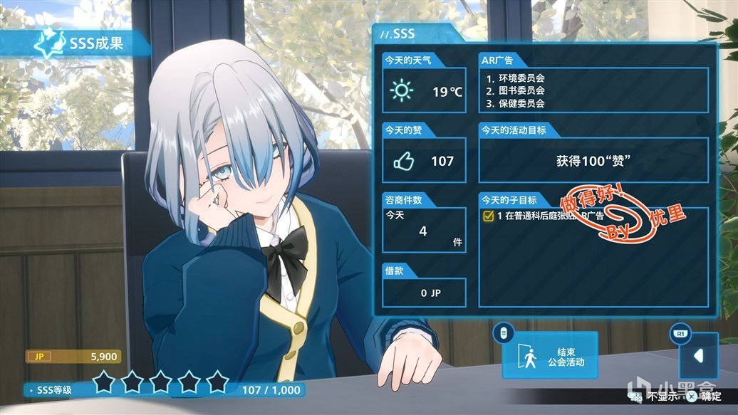 玩家既可以根據每日委託列表來完成各事項,也可以自己幹自己的,滿校園撿垃圾貼廣告,只要積滿規定數量的贊,當日社團活動便算完成。