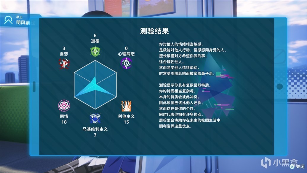在遊戲開始前,系統會讓玩家做一份心理問卷調查,來決定玩家的三元屬性,這主要體現在對話中的一些特殊選項上和隱藏的被動技能,同時在每一章結束後玩家都會獲得一份問卷調查,我個人建議沒必要爲了屬性而答題,順其自然就好。