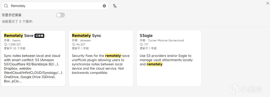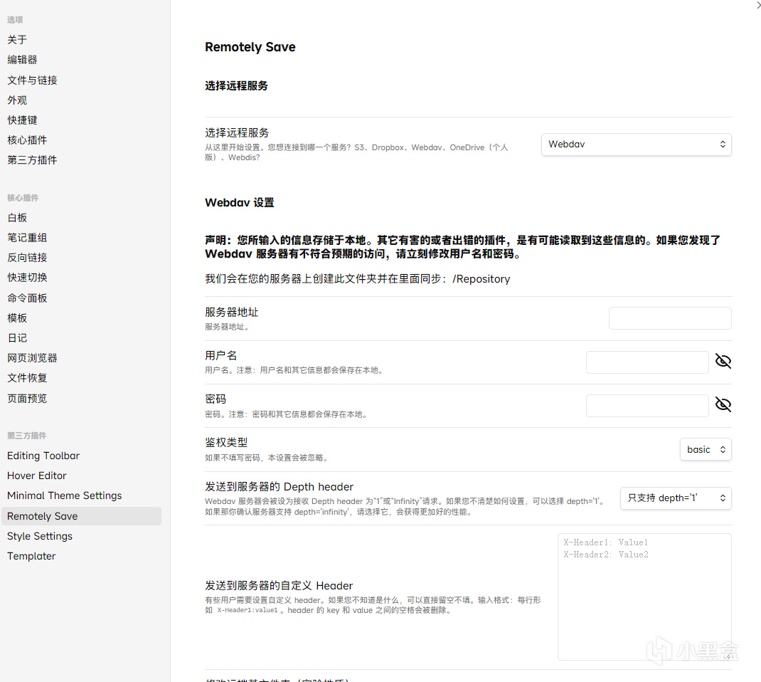 下载安装即可,如果加载不出第三方插件请开启云梯或者去国内插件商PKmer Market,安装后再搜索Remotely save(Obsidian插件市场本质上都是Github链接引用,如果没有云梯还不想安装PKmer,可以安装备受好评的Watt Toolkit清除DNS污染加速Github)。安装好并开启Remotely save后进入设置页面: