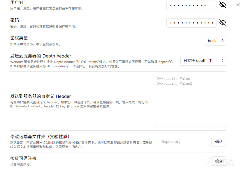 服务器地址、用户名、密码即为InfiniCloud个人页面顺序三项,复制粘贴即可,其余插件空格、选项均无需改动,该插件部分功能付费(多设备文件冲突处理等),大家可自行探索。输好信息后,我们稍稍下滑: