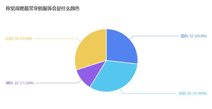 最後是服飾的顏色,除了綠的之外,紅的藍的白的的得票都非常接近!最終白色以4票的優勢拔得頭籌!