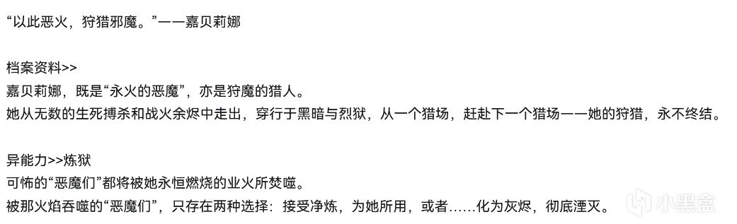 嘉貝莉娜的檔案資料也很有意思,說是“永火的惡魔,亦是狩魔的獵人”,從無數生死搏殺走出,穿行黑暗烈獄,永不終結的狩獵,怎麼感覺可以跟贊妮認識一下,全都屬牛馬的。這個自身是惡魔並狩獵惡魔的人設也是直接不演了,實錘追星鬼泣是吧。不過在鳴潮裏能稱得上是惡魔的除了鳴式還有什麼?她身上幾個惡魔影子又是從哪裏抓到的,也是鳴式的一部分嗎?從安吉拉長大成爲嘉貝莉娜並且一直在殺戮狩獵,這十六年嘉貝莉娜都經歷了什麼?這些疑點還是得保留到2.7才能瞭解嘍。