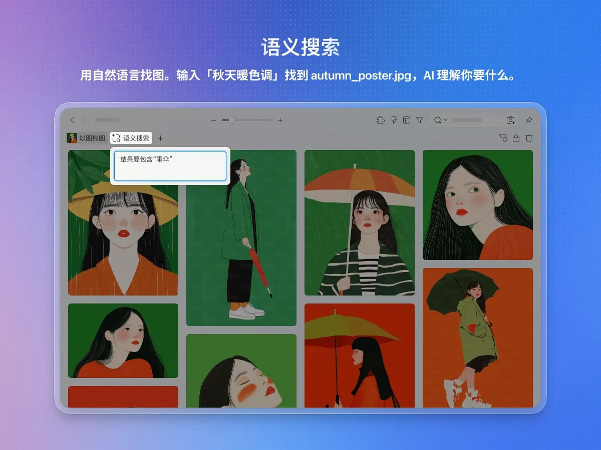输入「暖色调的极简海报」→ 精准匹配你的记忆