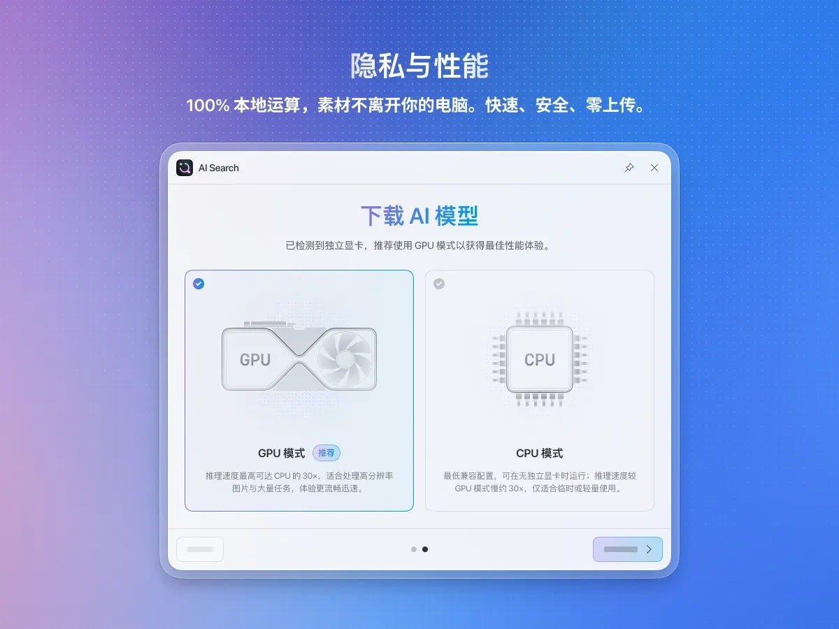 ✅ 本地优先 — AI Search 零上传,10万张图片也不会离开你的硬盘