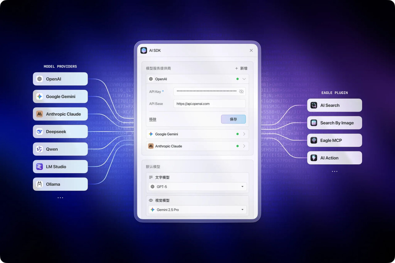 最烦人的事:每装一个 AI 插件,都要重新设定 API Key、选模型、配环境...Eagle 5.0 的解法:设定一次,所有插件都能用。