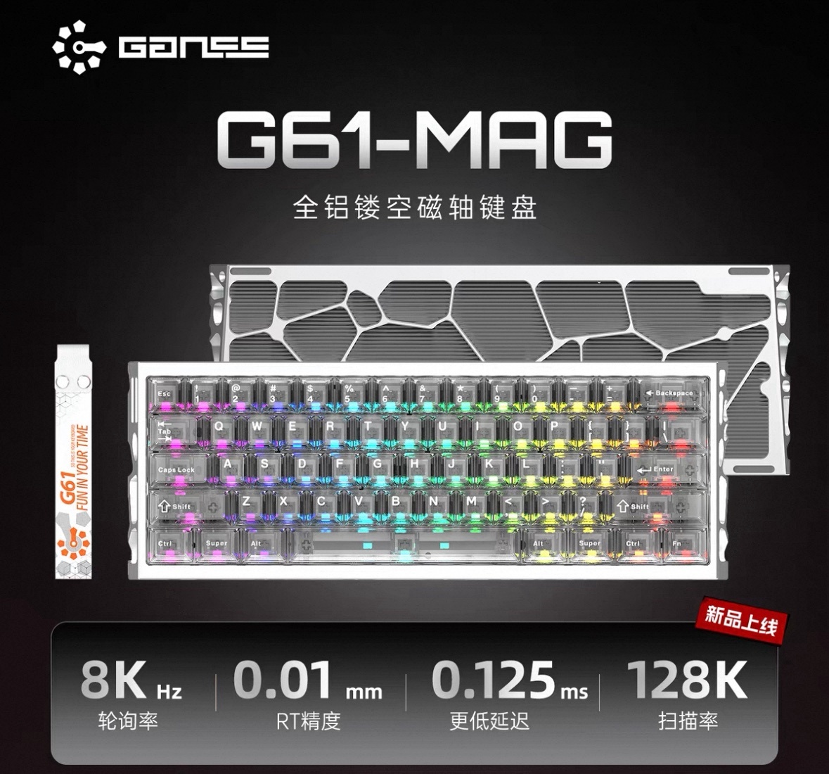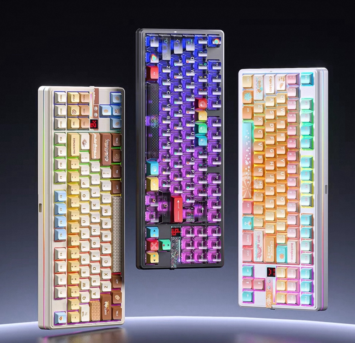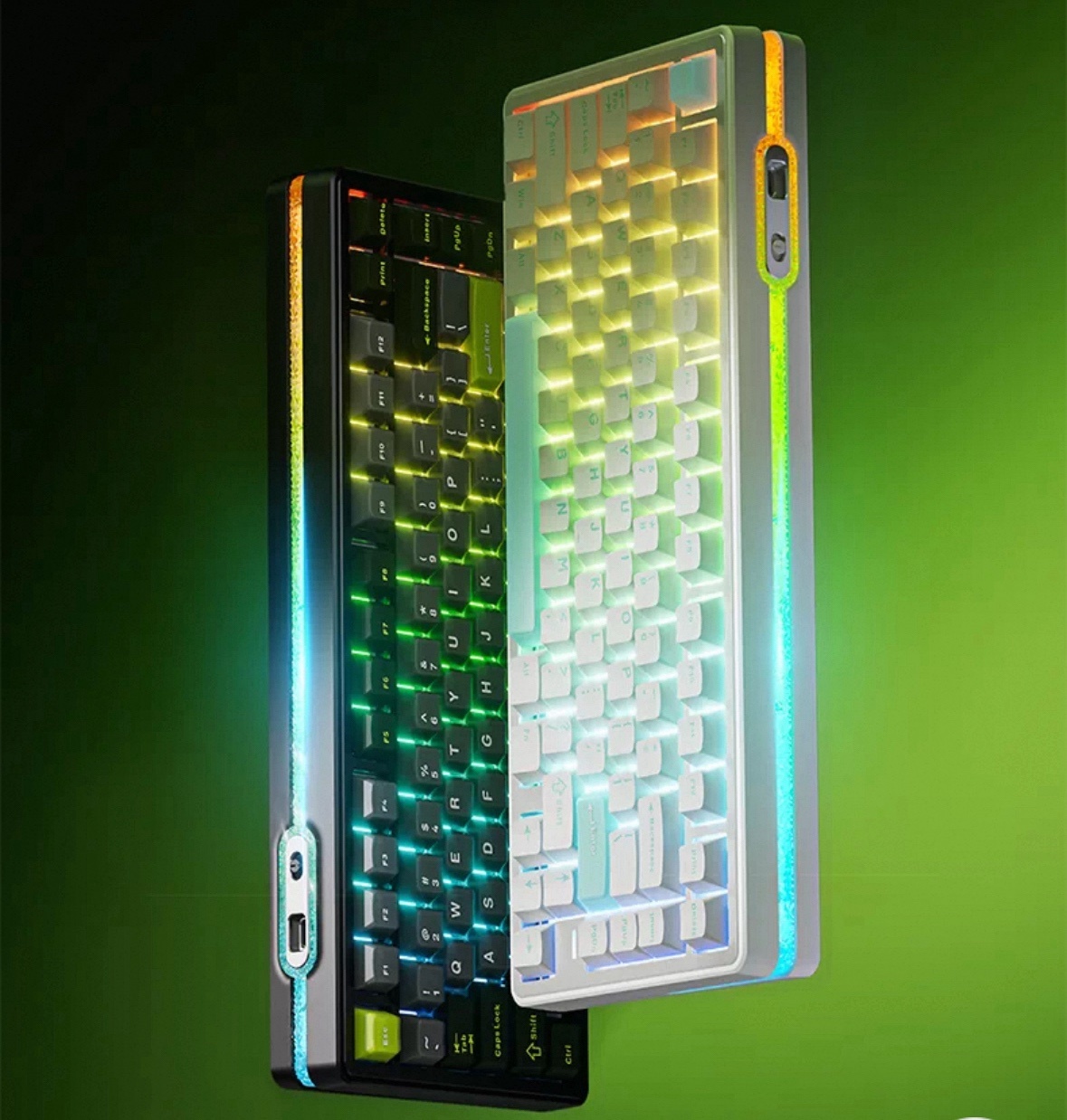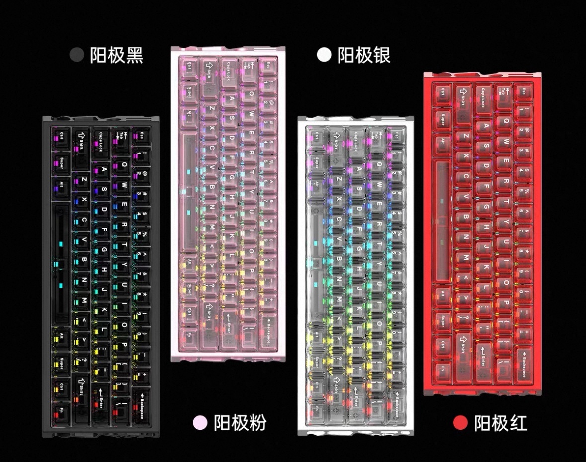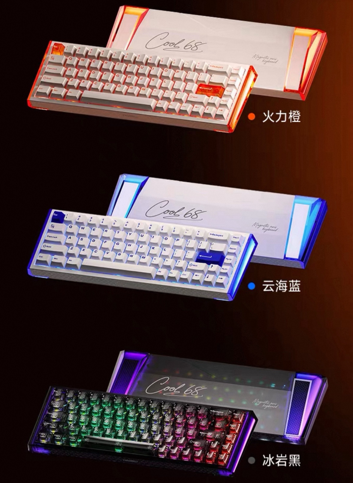 主打的就是一个性价比,国补后288起,全铝CNC机身,阳极氧化工艺,碰珠磁吸快拆可自由DIY,目前75配列我最喜欢的键盘之一;全系三灯珠,配上雾透键帽,灯光亮到爆炸;